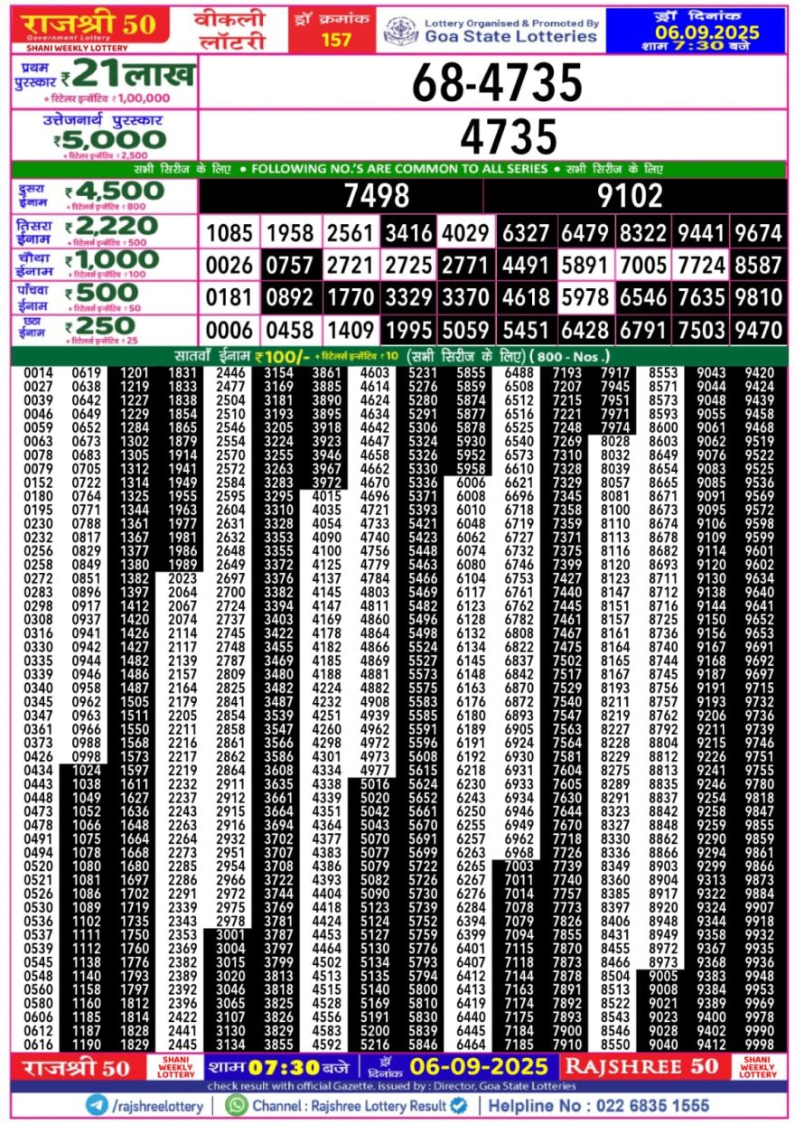 Rajshree 50 Shani Weekly Lottery Result 7.30pm 06/09/2025 September 6, 2025 Leave a Comment on Rajshree 50 Shani Weekly Lottery Result 7.30pm 06/09/2025 Related Results Rajshree Friday 8pm Weekly Lottery Result 05/12/2025 Rajshree 50 Shukra Weekly Lottery Result 7.30pm 05/12/2025 Rajshree 10 Evening Shukra Weekly Lottery Result 5.40pm 05/12/2025 Rajshree Jasmine 4pm Weekly Lottery Result 05/12/2025