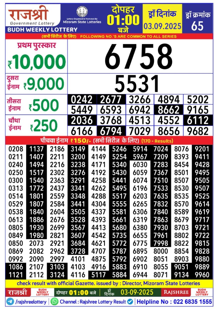 Rajshree Budh 1pm Weekly Lottery Result 03/09/2025 September 3, 2025 Leave a Comment on Rajshree Budh 1pm Weekly Lottery Result 03/09/2025 Related Results Dear Vision 1pm Saturday Weekly Lottery Result 06/12/2025 Dear Victory Friday Weekly Lottery Result 1pm 05/12/2025 Dear Star 1pm Thursday Weekly Lottery Result 04/12/2025 Rajshree Budh 1pm Weekly Lottery Result 03/12/2025