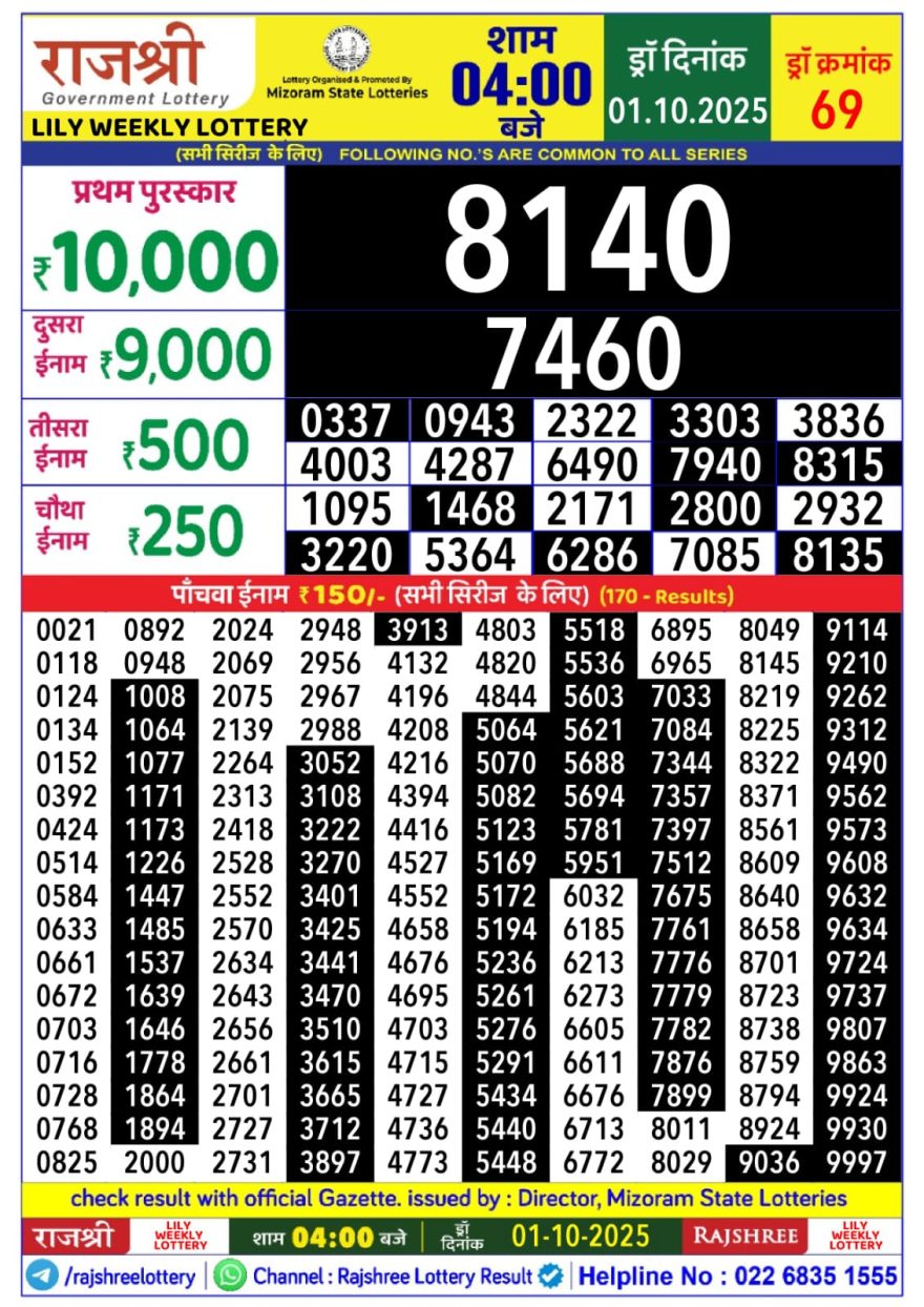 Rajshree Daily 4pm Weekly Lottery Result 01/10/2025 October 1, 2025 Leave a Comment on Rajshree Daily 4pm Weekly Lottery Result 01/10/2025 Related Results Rajshree Friday 8pm Weekly Lottery Result 05/12/2025 Rajshree 50 Shukra Weekly Lottery Result 7.30pm 05/12/2025 Rajshree 10 Evening Shukra Weekly Lottery Result 5.40pm 05/12/2025 Rajshree Jasmine 4pm Weekly Lottery Result 05/12/2025