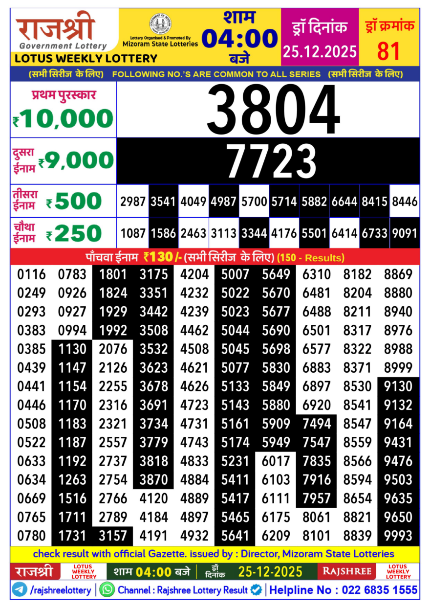 Rajshree Lotus 4pm Weekly Lottery Result 25/12/2025 December 25, 2025 Leave a Comment on Rajshree Lotus 4pm Weekly Lottery Result 25/12/2025 Related Results Rajshree 50 Ravi Weekly Lottery Result 7.30pm 25/01/2026 Rajshree Sunday 8pm Weekly Lottery Result 25/01/2026 Rajshree 10 Evening Ravi Weekly Lottery Result 5.40pm 25/01/2026 Rajshree Sunflower 4pm Weekly Lottery Result 25/01/2026