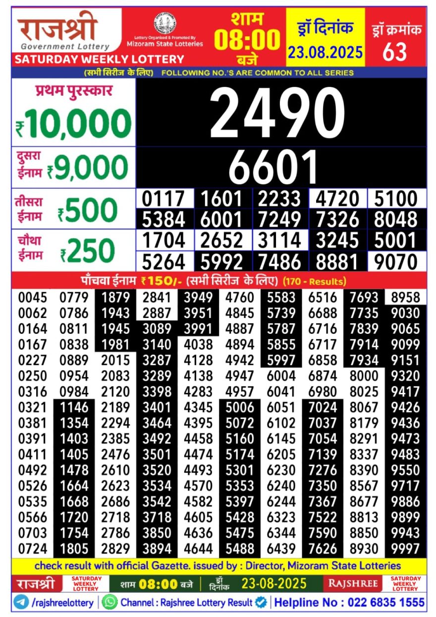 August 23, 2025  Leave a Comment on Rajshree Saturday 8pm Weekly Lottery Result 23/08/2025
