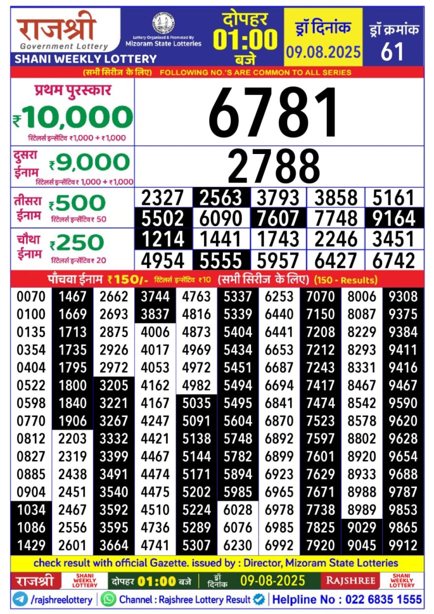 Rajshree Shani 1pm Weekly Lottery Result 09/08/2025