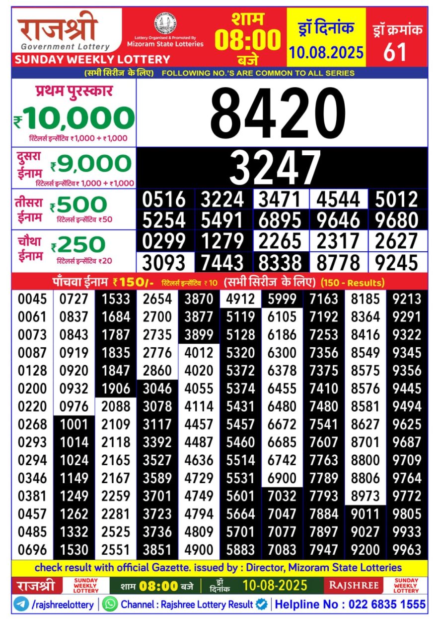 Rajshree Sunday 8pm Weekly Lottery Result 10/08/2025 August 10, 2025 Leave a Comment on Rajshree Sunday 8pm Weekly Lottery Result 10/08/2025 Related Results Rajshree 8pm Monday Weekly Lottery Result 15/12/2025 Rajshree 50 Som Weekly Lottery Result 7.30pm 15/12/2025 Rajshree 10 Evening Som Weekly Lottery Result 5.40pm 15/12/2025 Rajshree Marigold 4pm Weekly Lottery Result 15/12/2025