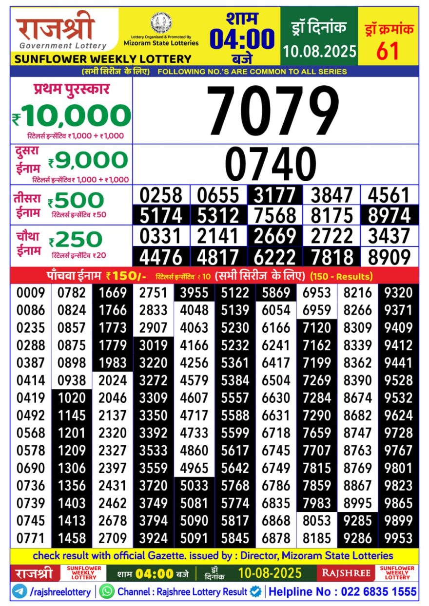 Rajshree Sunflower 4pm Weekly Lottery Result 10/08/2025