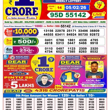 2026-02-05 Rajshree Night  Weekly Lottery Result 9pm 05/02/2026  2026-02-05 Rajshree 50 Guru 7.30pm Weekly Lottery Result 05/02/2026  2026-02-05 Rajshree Thursday  8pm Weekly Lottery Result 05/02/2026  2026-02-05 Dear Fame 8pm Thursday  Weekly Lottery Result 05/02/2026  2026-02-05 Golden Star Guru 7PM Weekly Lottery Result Today 05/02/2026  2026-02-05 Rajshree 100 Monthly lottery Result 05/02/2026  2026-02-05 Dear Supreme 6pm Thursday Weekly Lottery Result 05/02/2026  2026-02-05 Rajshree 10 Evening Guru 5.40pm Weekly Lottery Result 05/02/2026  2026-02-05 Punjab State Dear 50 5pm Thursday  Weekly Lottery Result 05/02/2026  2026-02-05 Labh Laxmi Glad 4pm Thursday Weekly Lottery Result 05/02/2026  2026-02-05 Rajshree Lotus 4pm Weekly Lottery Result 05/02/2026  2026-02-05 Kerala Lottery Result Karunya Plus KN-609 Today 05/02/2026  2026-02-05 Rajshree Guru 2.25pm Weekly Lottery Result 05/02/2026  2026-02-05 Dear Star 1pm Thursday Weekly Lottery Result 05/02/2026  2026-02-04 Rajshree Night  Weekly Lottery Result 9pm 04/02/2026  2026-02-04 Rajshree 50 Budh 7.30pm Weekly Lottery Result 04/02/2026
