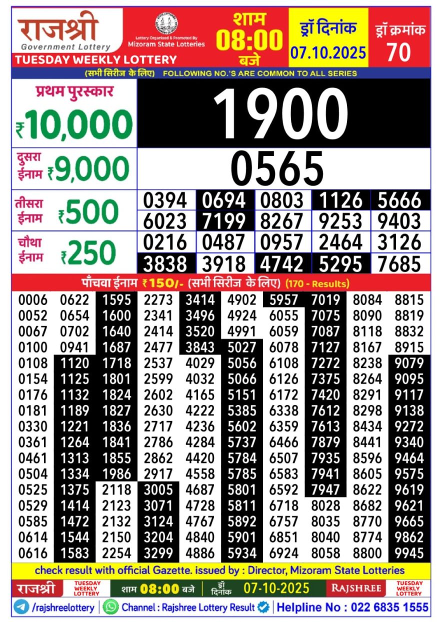 Rajshree Tuesday 8pm Weekly Lottery Result 07/10/2025