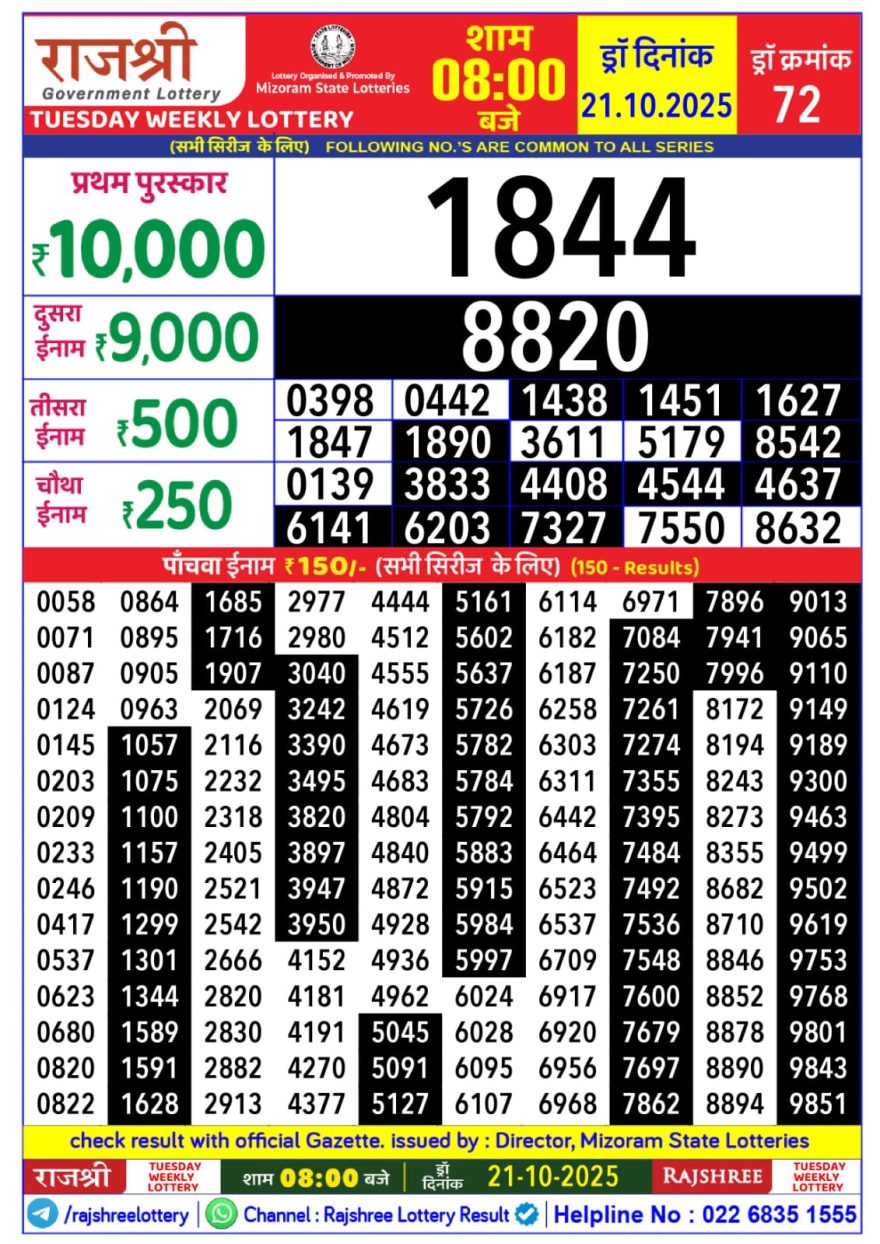 October 21, 2025  Leave a Comment on Rajshree Tuesday 8pm Weekly Lottery Result 21/10/2025