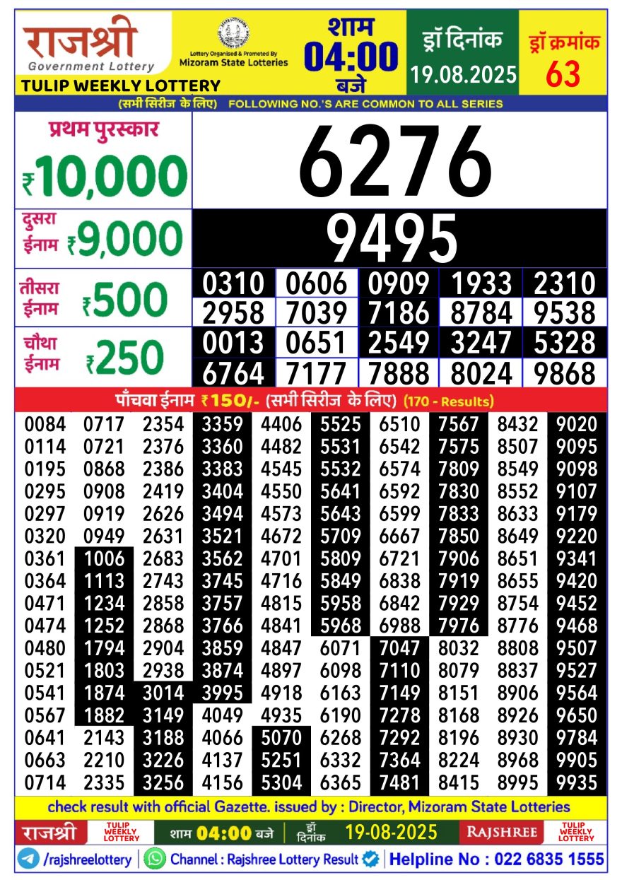 Rajshree Tulip 4pm Weekly Lottery Result 19/08/2025 August 19, 2025 Leave a Comment on Rajshree Tulip 4pm Weekly Lottery Result 19/08/2025 Related Results Rajshree 50 Shani Weekly Lottery Result 7.30pm 06/12/2025 Rajshree Saturday 8pm Weekly Lottery Result 06/12/2025 Rajshree 10 Evening Shani 5.40pm Weekly Lottery Result 06/12/2025 Rajshree Orchid 4pm Weekly Lottery Result 06/12/2025