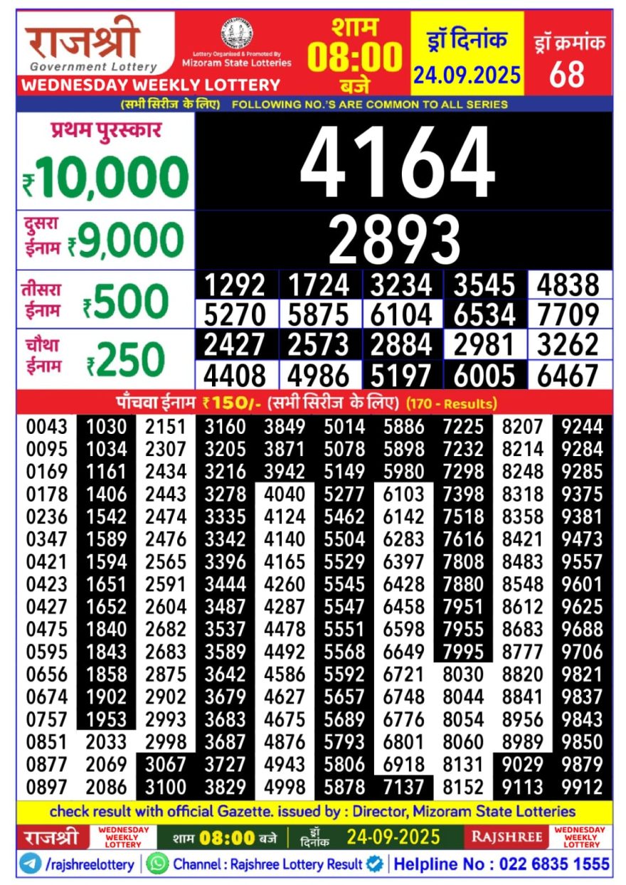 Rajshree Wednesday 8pm Weekly Lottery Result 24/09/2025 September 24, 2025 Leave a Comment on Rajshree Wednesday 8pm Weekly Lottery Result 24/09/2025 Related Results Rajshree 50 Shani Weekly Lottery Result 7.30pm 06/12/2025 Rajshree Saturday 8pm Weekly Lottery Result 06/12/2025 Rajshree 10 Evening Shani 5.40pm Weekly Lottery Result 06/12/2025 Rajshree Orchid 4pm Weekly Lottery Result 06/12/2025