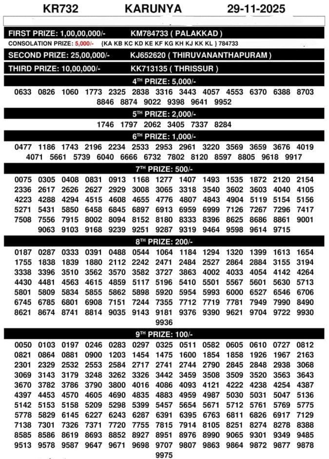 Karunya KR729 Result 01/11/2025 Kerala Lottery Result