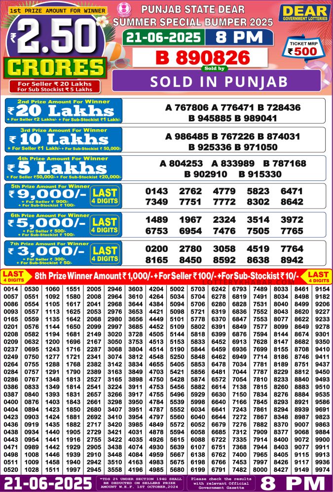 Punjab State Dear Summer Special Bumper Lottery Result 21/06/2025 – Check 2.5 Crore Winner Now! The Punjab…